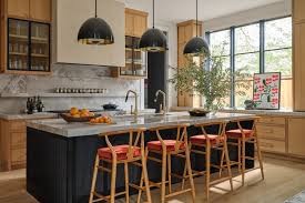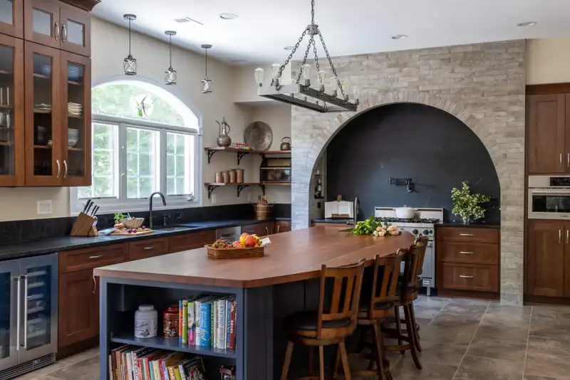 Mixed materials like stone hoods, metal trims, and glass accents adding depth.