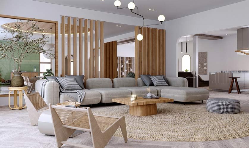 Wide-open layouts with subtle zones, using partial walls or furniture to define spaces without closing off flow—perfect for entertaining in our social culture.